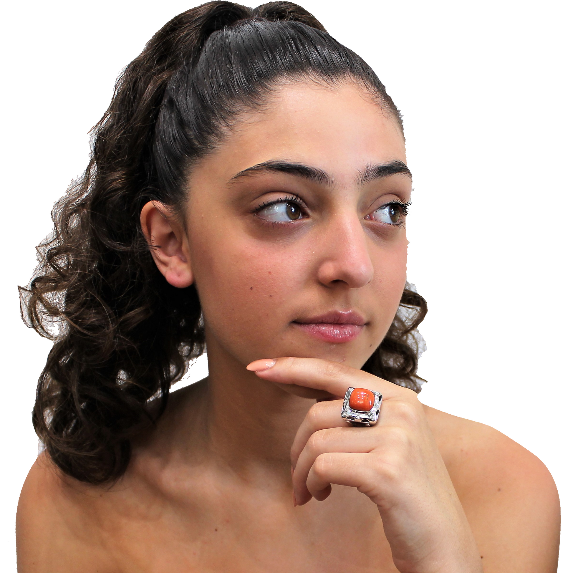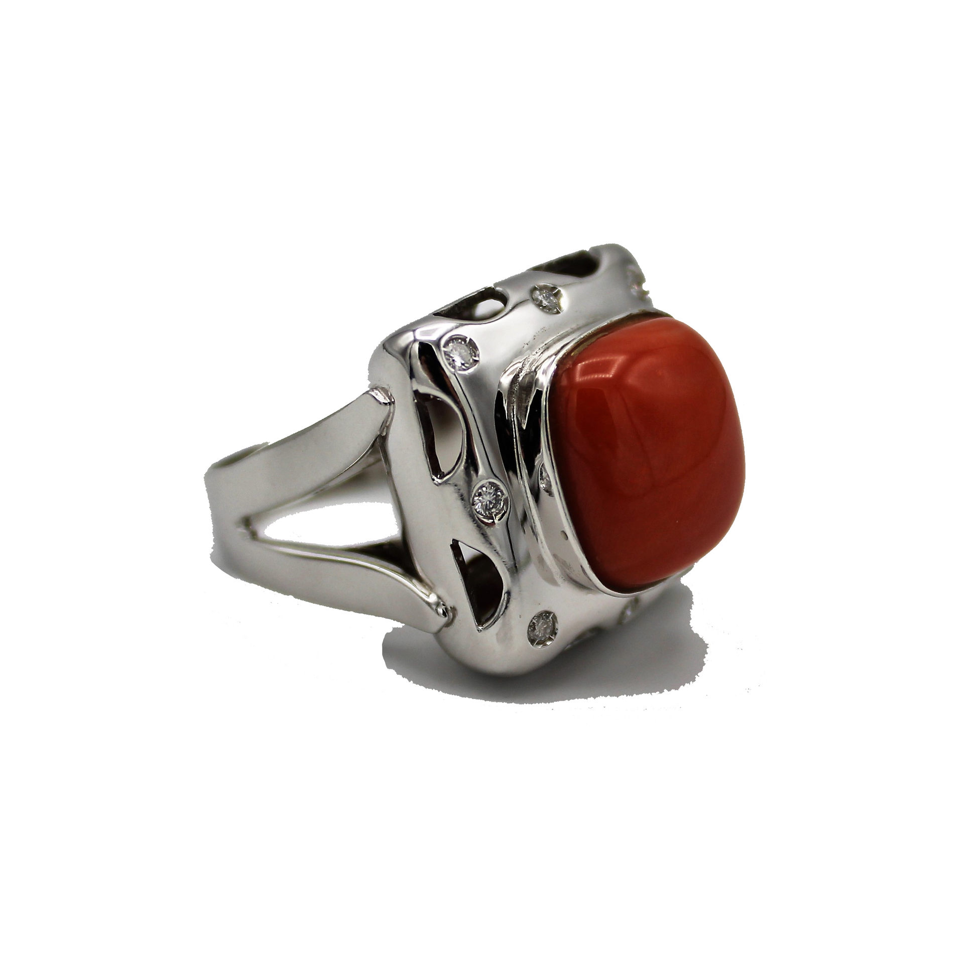Ring in 18 carat white gold, square natural red coral and diamonds ct 0.16.