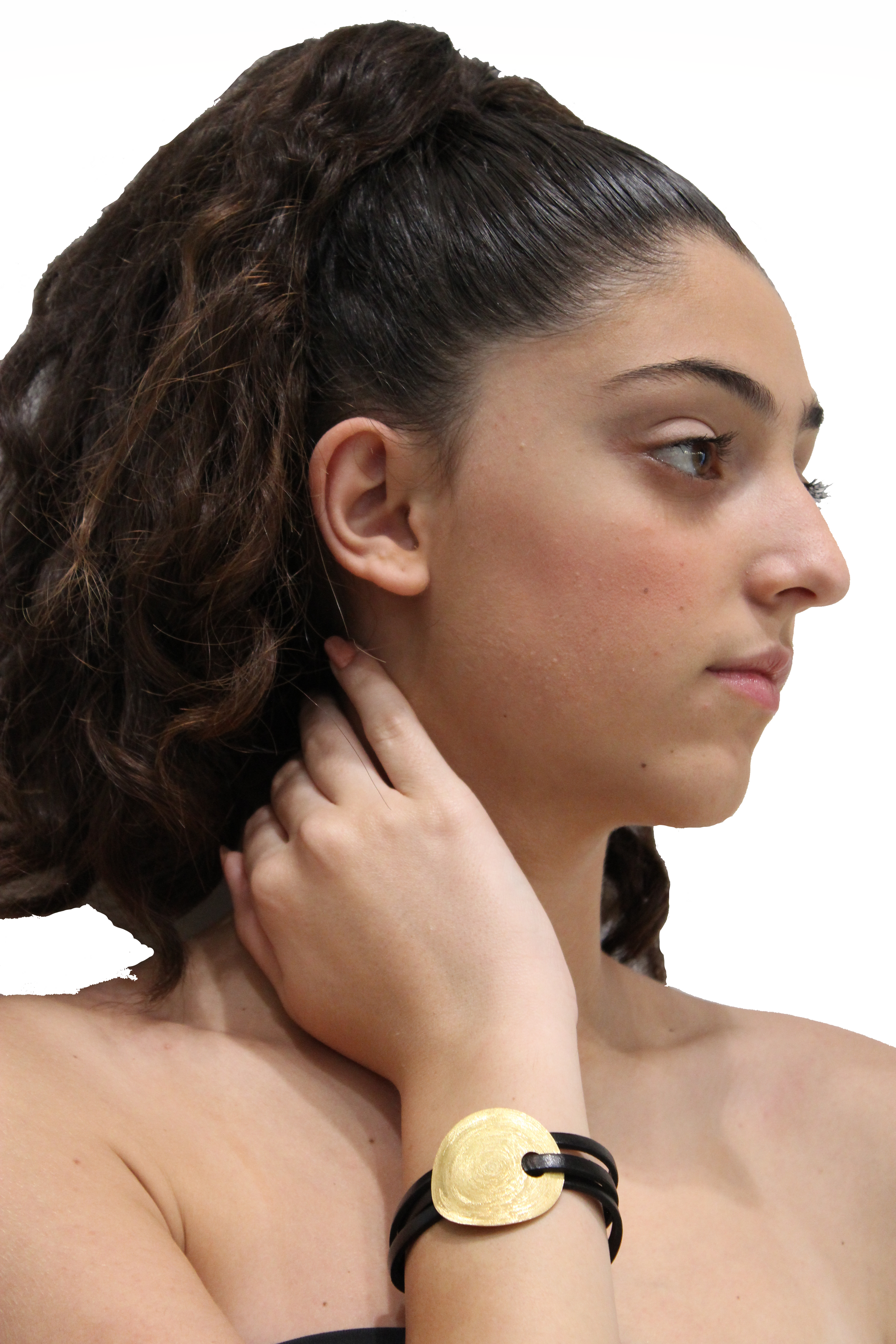 Bracelet three strands in leather and central round shape in silver 925 gold plated diamond cut