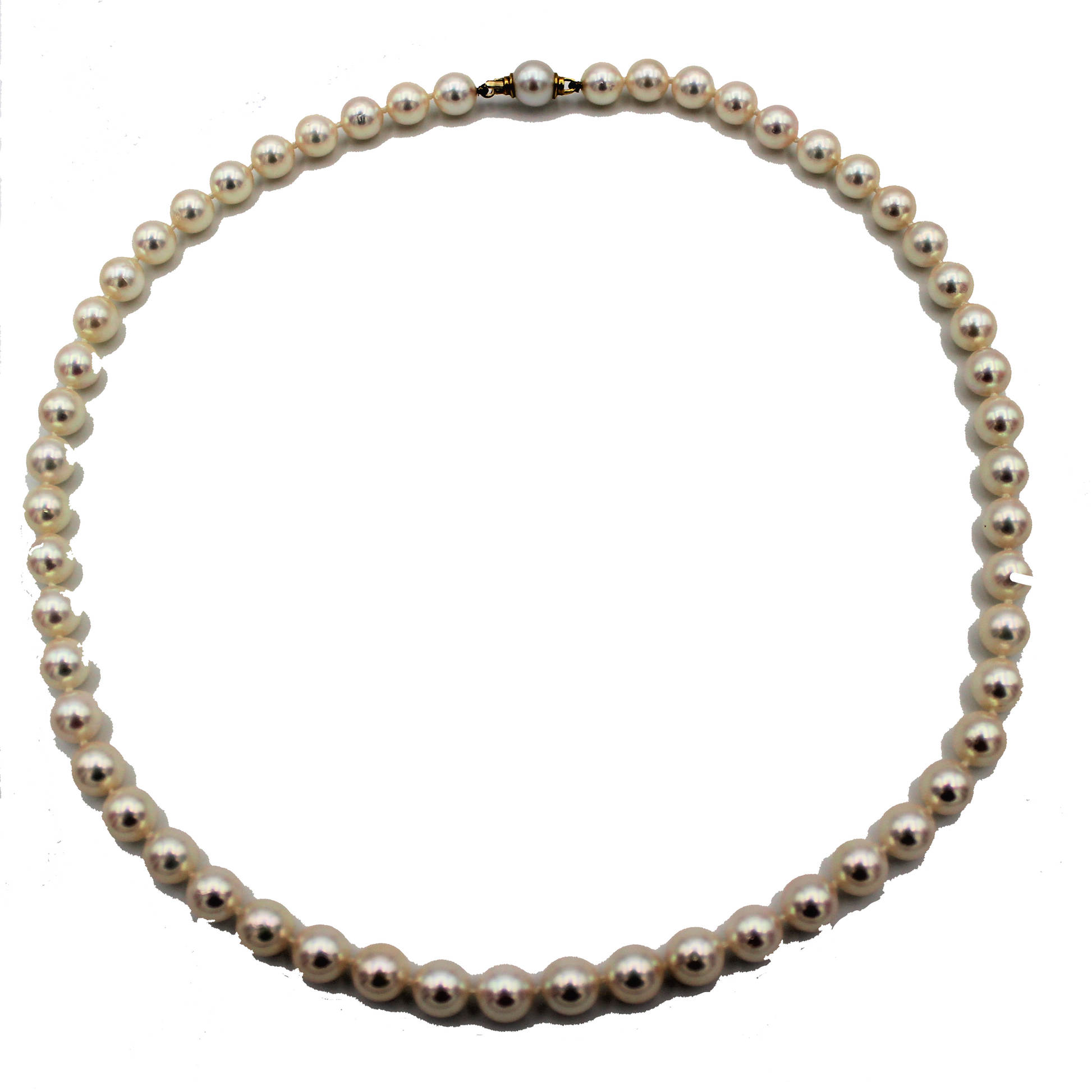 Classic pearl necklace Akoya salt water, good quality, white colour, diameter 7,5-8 mm, with closure in 18 carat gold and Akoya pearl. Length cm 45.