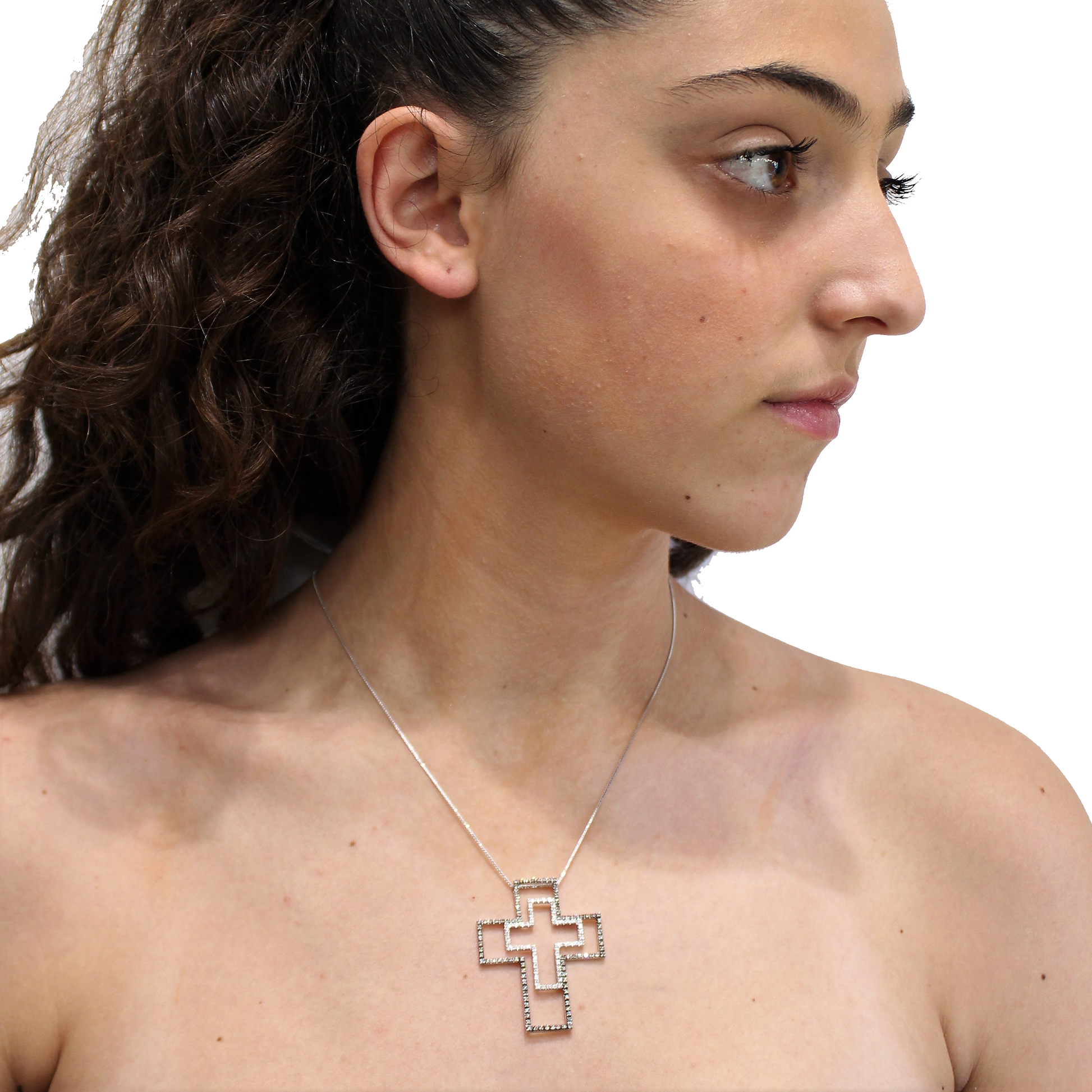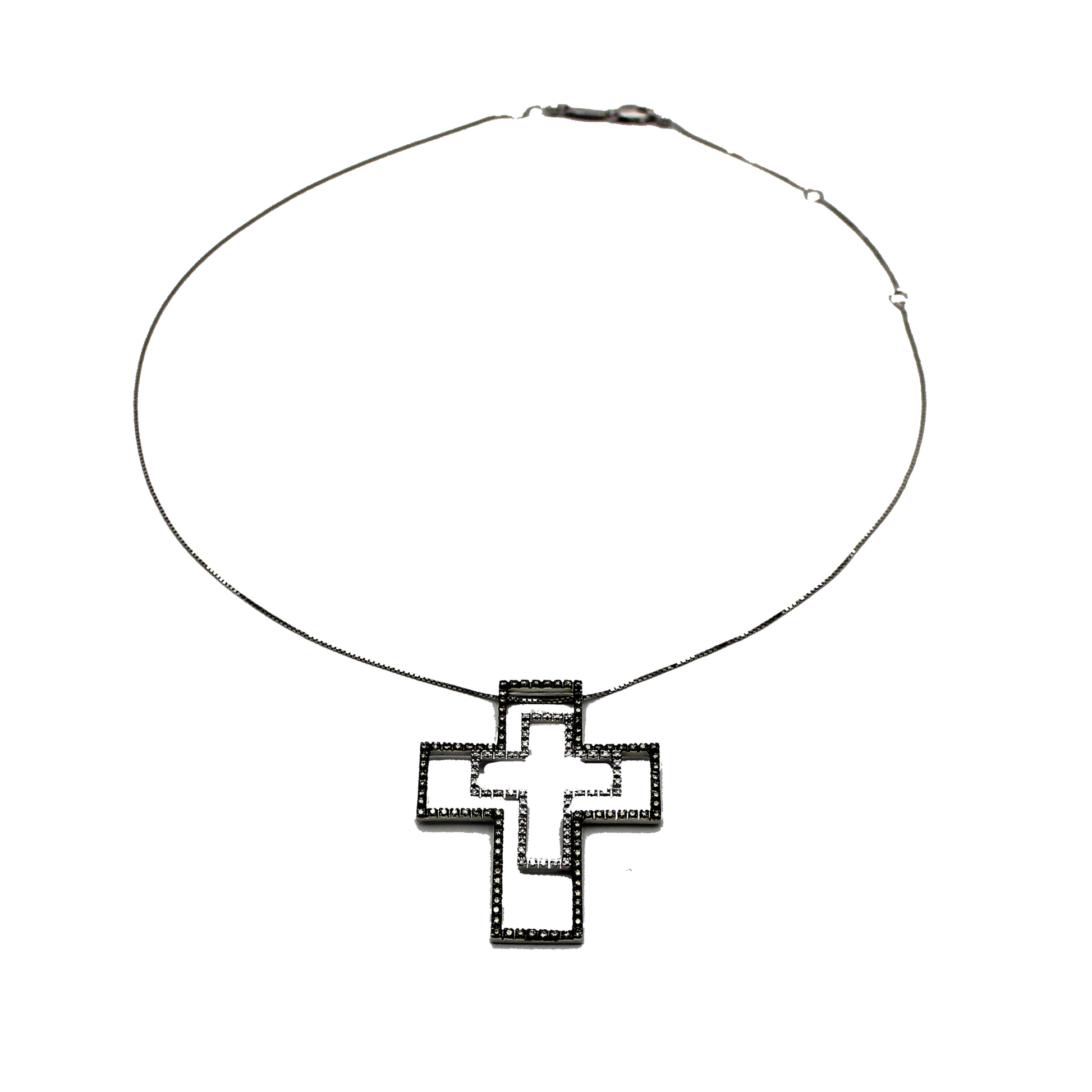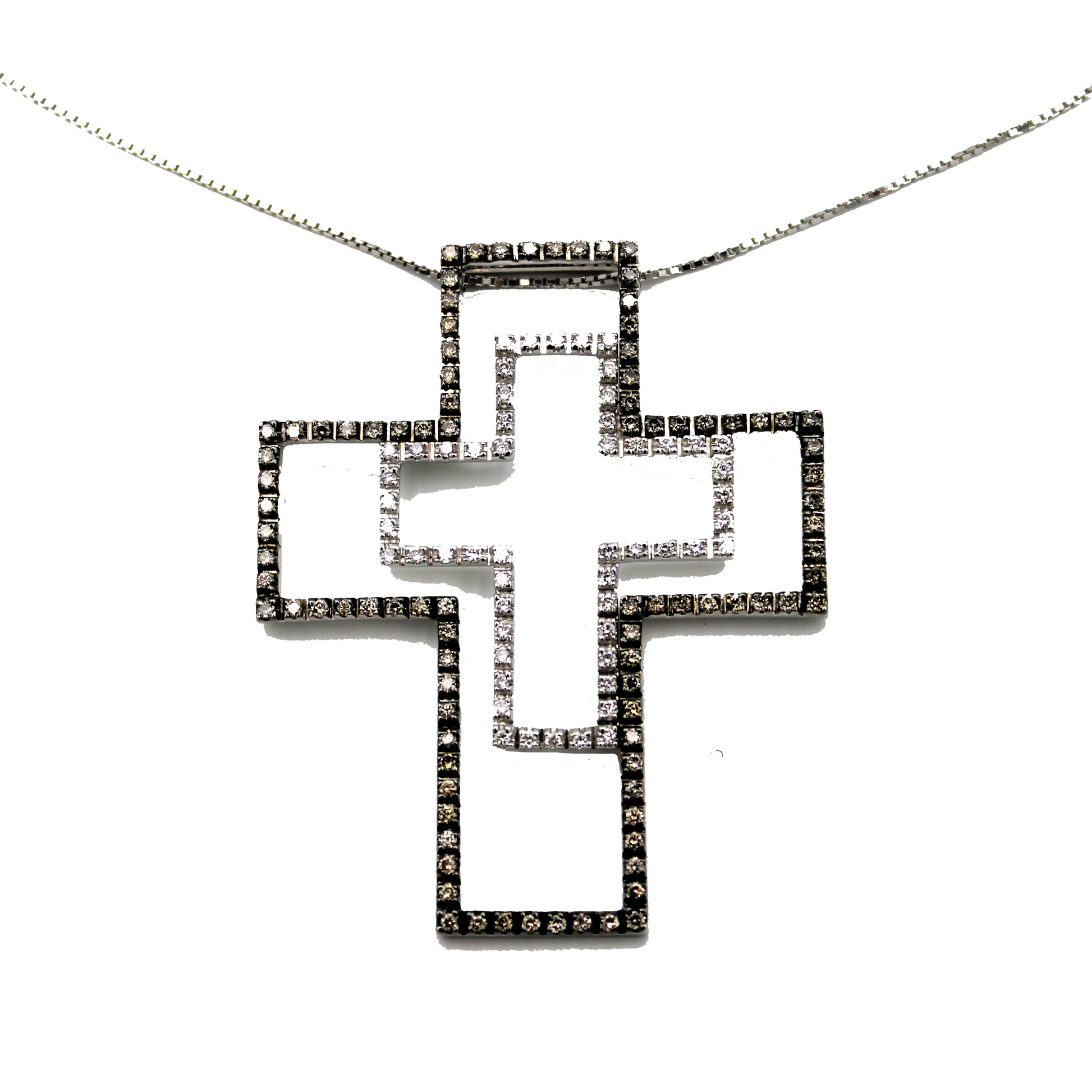 Chain with cross in 18 carat white gold, white diamonds ct. 0.27 and brown diamonds ct. 0.65