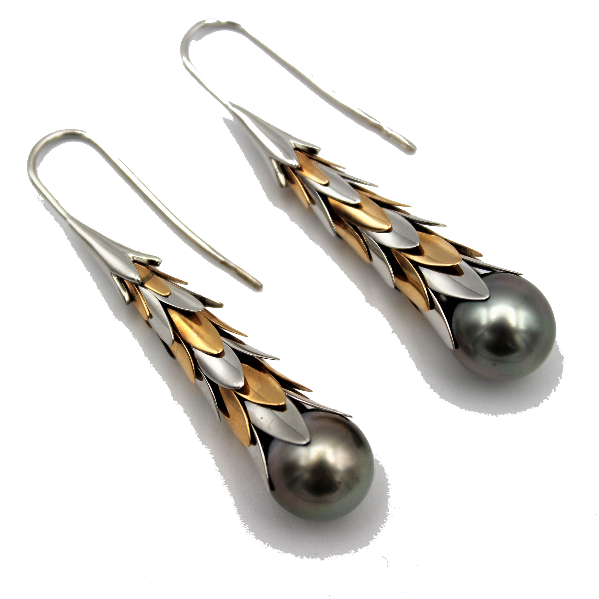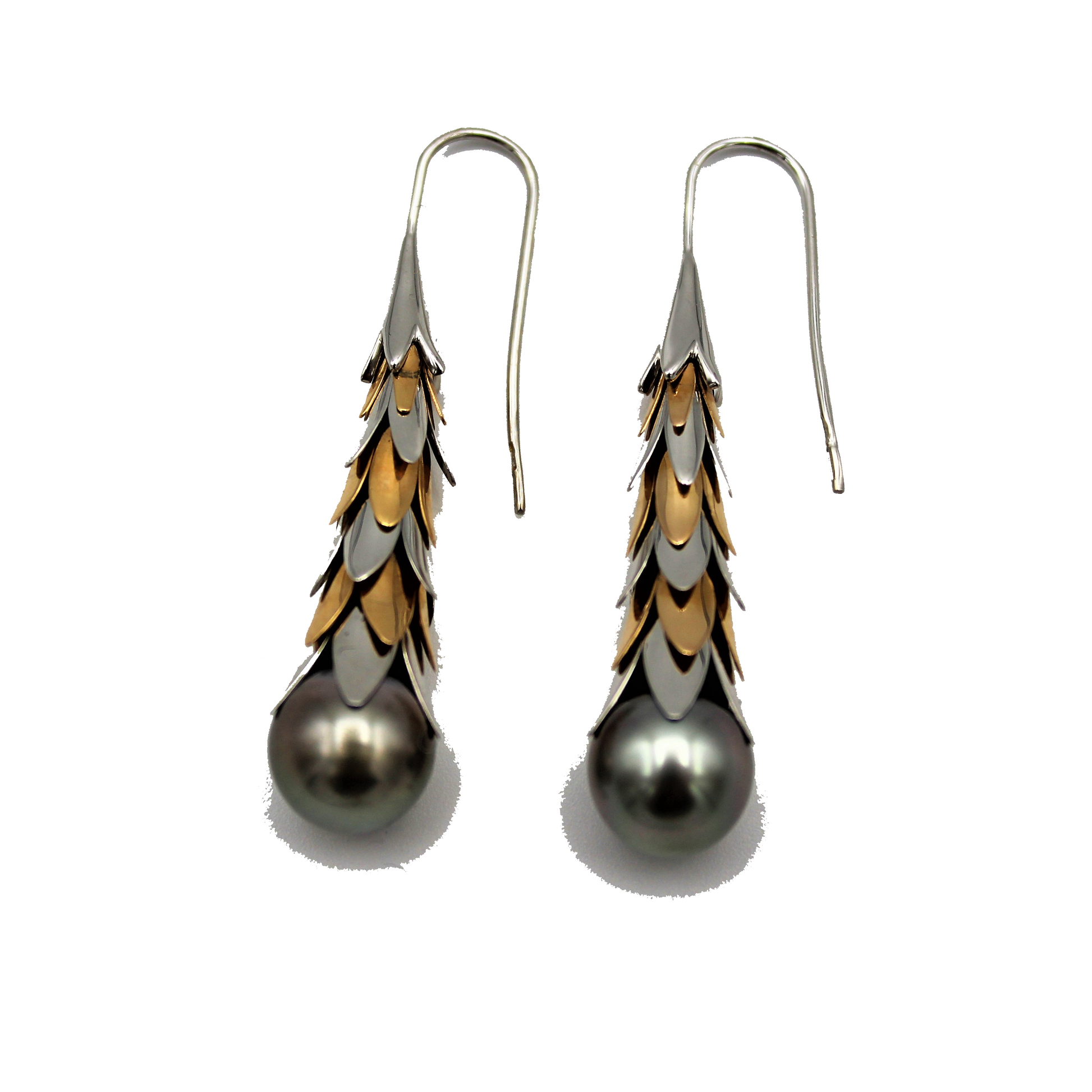 Earrings in 18 carat white and rose gold with two drop Tahiti pearls size 10-10,5 mm. Hook closure. Length cm 4,8.