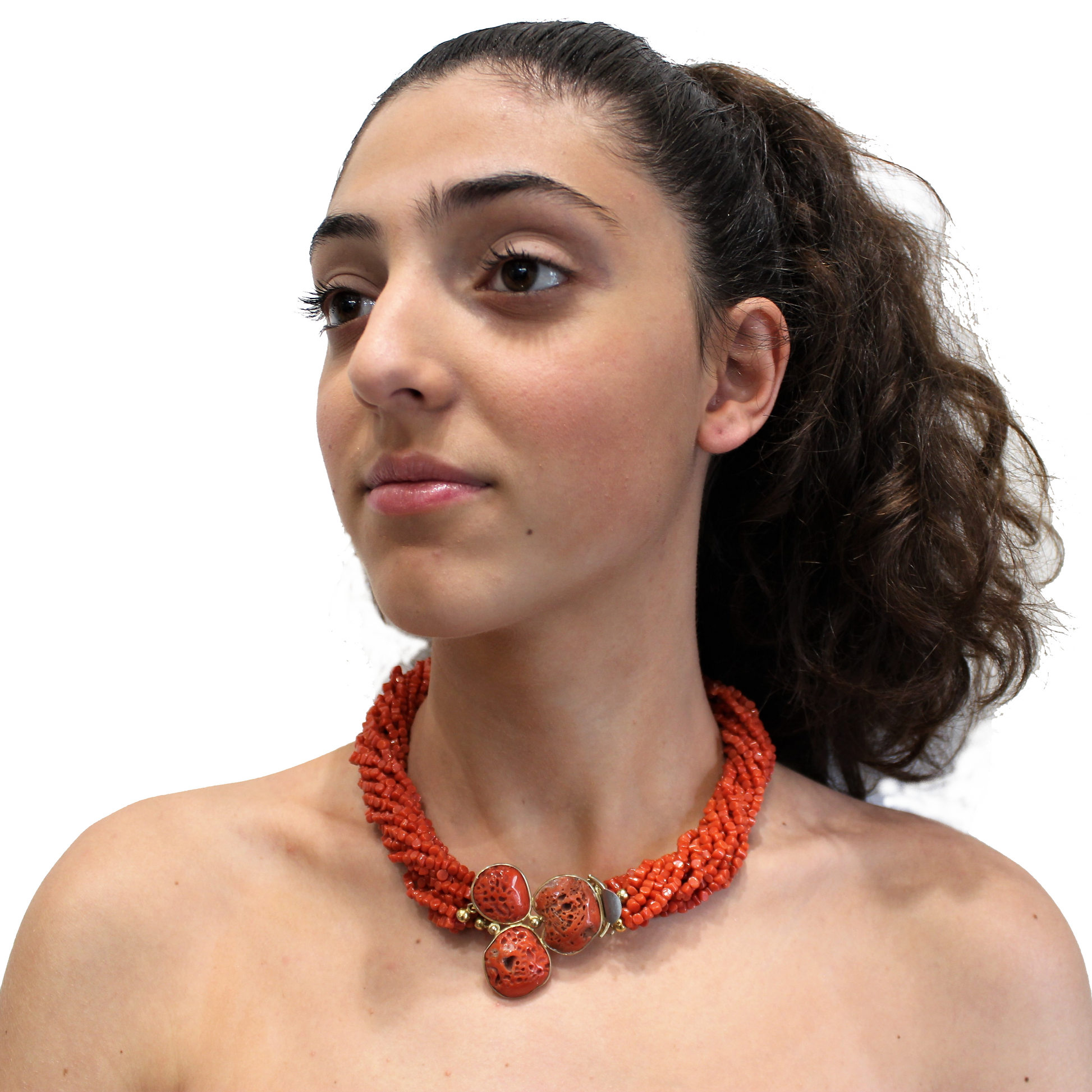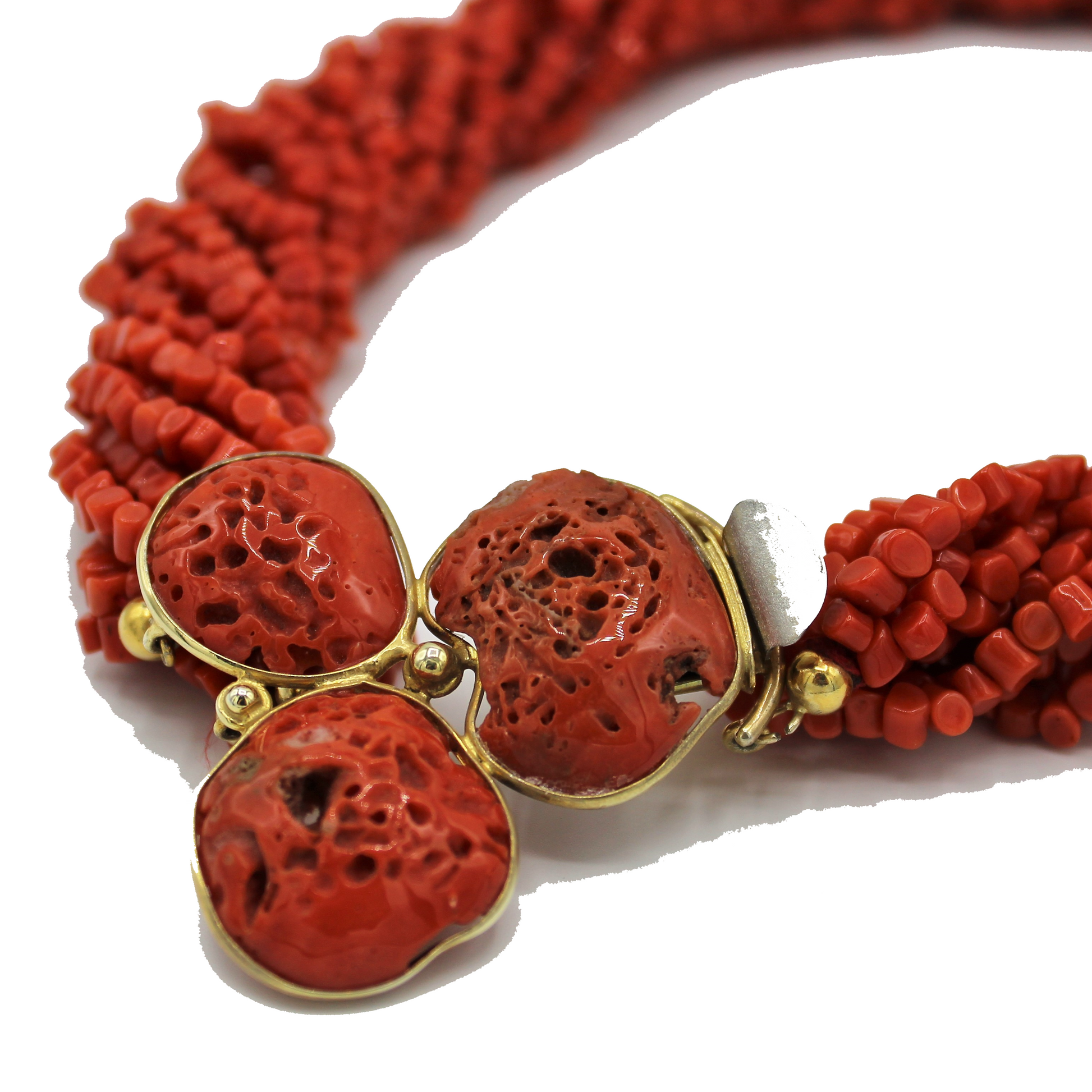Twelve strands in natural red rough coral silver 925 gold plated clip with three rough corals. Clip width cm 4
